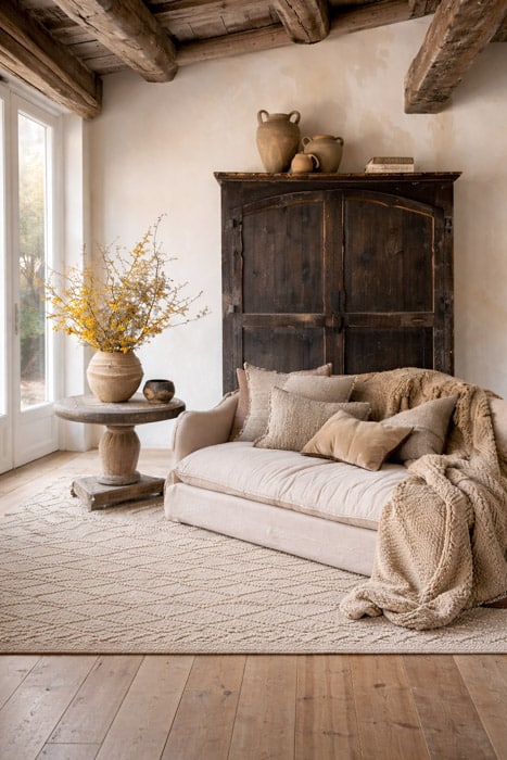 Statt viele unterschiedliche Materialien zu mischen, entsteht eine stimmige Atmosphäre oft durch Wiederholung weniger Elemente. Ein klarer Materialfokus sorgt dafür, dass der Raum ruhiger wirkt.